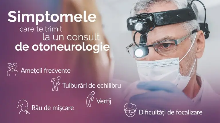 Simptomele care pot indica necesitatea unui consult de otoneurologie includ amețeli frecvente, tulburări de echilbru, rău de mișcare, vertij (senzația că lucrurile se rotesc în jur), paralizia facială sau dificultățile de focalizare.